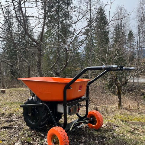 Sami Tow-Behind Sandspreder med målene 100x76x39 cm. Egnet for påhengsmaskiner eller traktorer for spredning av sand eller grus. Utstyrt med hjul for enkel transport og montering bak kjøretøy.