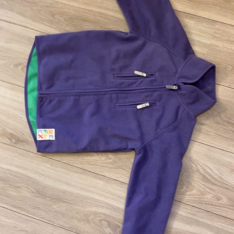 En helt super jakke i lilla fleece med grønt for. Kjempegod å ha på ifølge eieren. Tre glidelåser som fungerer, to lommer foran i tillegg til den vanlige låsen. Hull til tommeltottene nederst på ermene så den luner godt ved ev behov. Ingen flekker eller slitemerker.