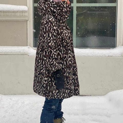 Leo Puffers Midi Jacket by Ganni. A trendy puffer jacket with a higher collar and a hood for extra warmth. The jacket closes at the front with a zipper. Decorative side pockets and an all-over leopard print. This jacket is suitable all winter for all occasions.