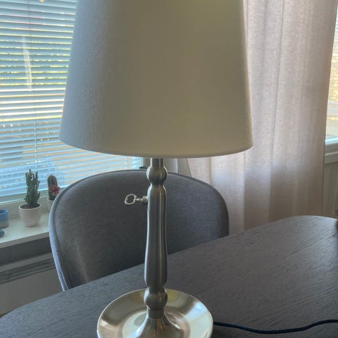 Søt liten lampe med «blondeskjerm» i frostet glass. Høyde ca 39 cm, lampefot ca 15 cm i diameter og ca. 2 m ledning. Lampe som er en fin liten lyskilde. Har bare stått på et piano