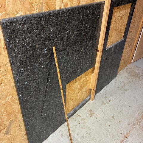 Stor polert Granitt benkeplate, har vært brukt på en kjøkkenøy.
