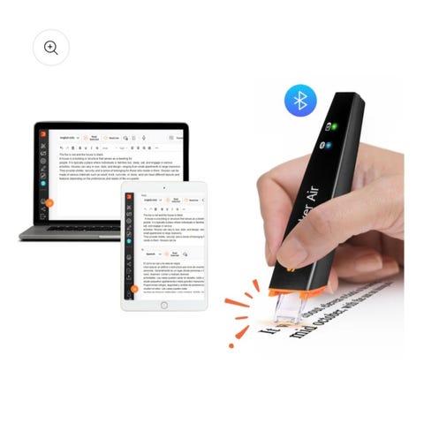 Scanmarker Air, en smart digital penneskanner som lar deg skanne tekst rett inn på PC, Mac, nettbrett eller mobil. Kobles bare til via Bluetooth, eller medfølgende usb-kabel. BLE-dongle følger ikke med, men behøves heller ikke. Følger med et praktisk etui.