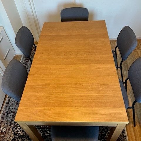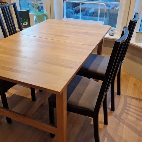 Pent spisebord med 6 stoler fra Bohus selges rimelig. Bordet har normal slitasje, og én litt mer merkbar flekk (se bilde), men ingen større hakk eller skader. Stolene er i god stand, foruten den ene, hvor foten har vridd seg noe (merkes stort sett ikke når man sitter på den). Følger med ileggsplate på 45cm.