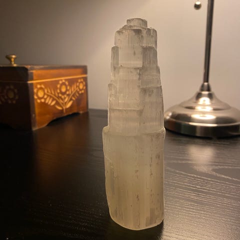 Selenitt krystall i tårnform, hvit farge, naturlig mineral. Kan brukes til dekorasjon eller i krystall- og energiarbeid.