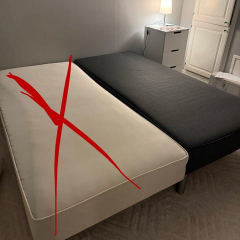 IKEA seng med enkel design, egnet for ettromsrom eller gjesterom. Sengen har en nøytral farge som passer til ulike interiørstiler. Hvit seng songesand fra ikea