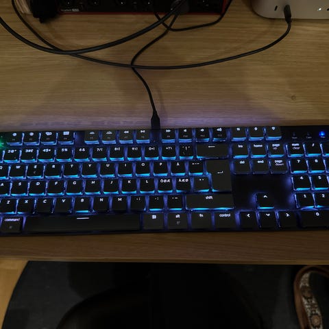 Keyboardet er et fullstørrelse low-profile tastatur med Gateron Low Profile Brown switcher, som gir en sykt behagelig balanse mellom skrivefølelse og lyd. Switchene er hot-swappable, så de kan enkelt byttes.