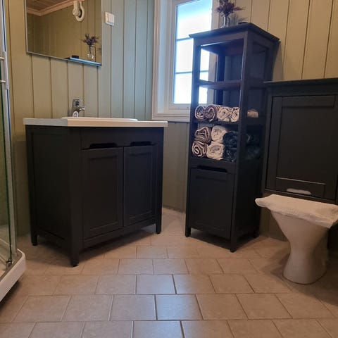 Servantskap 90cm i god stand med tilhørende vask, kran og toalettrull holder.