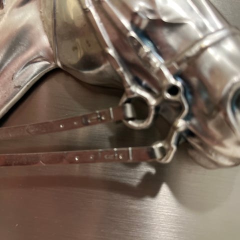 Stor og dekorativ hestefigur i lys naturfarget stein/steinlignende materiale. Forestiller en steilende hest med fine detaljer i man og muskulatur. Gir et klassisk og litt dramatisk uttrykk.