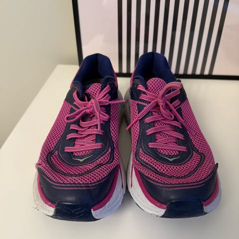 Hoka Bondi 7 sneakers joggesko i størrelse 38. Skoene har en kombinasjon av svart og rosa farge. Designet for komfort og støtte ved løping og daglig bruk.