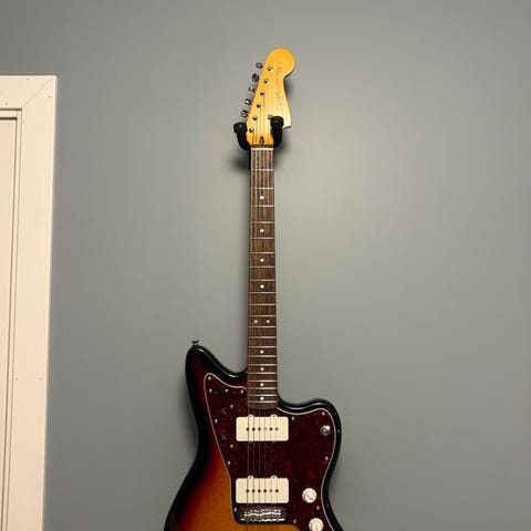 Fender Squire Jazzmaster elektrisk gitar i hvit farge. Gitaren har et klassisk design med to single-coil pickuper, rosewood gripebrett og tremolo system. Passer for bruk innen ulike musikkstiler.