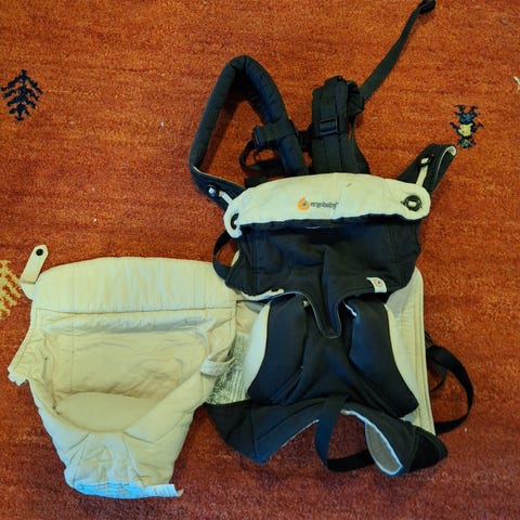 Nyvasket Ergobaby med grått nyfødtinnlegg selges. God bæresele som passer både mor og far.