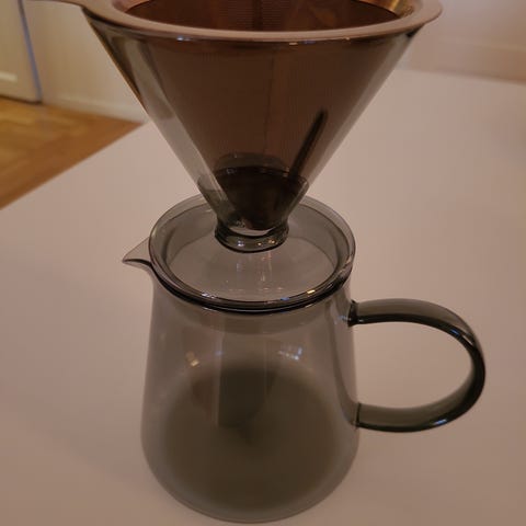 Selger en stilren kaffebrygger og kanne i én del, formet som et timeglass, laget av høykvalitets, varmebestandig glass.