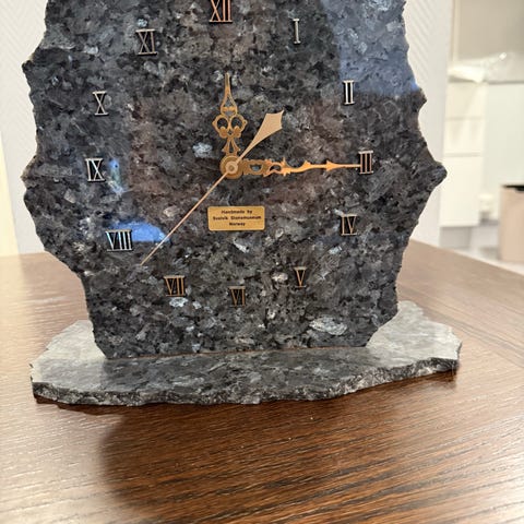 Bordklokke laget av skifer med gullfargede visere og timeindikatorer. Klokken har en naturlig utseende med varierende brune og beige toner. Egnet for plassering på bord eller hylle som en dekorativ tidtaker.