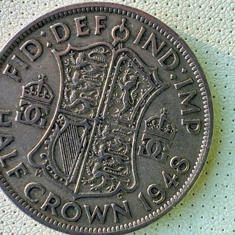 Storbritannia One Shilling mynt fra 1929 med bilde av Georg V og tekst rundt kanten. Mynten har tradisjonelt design med kongekronet løve på forsiden.