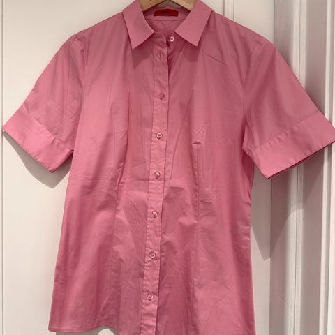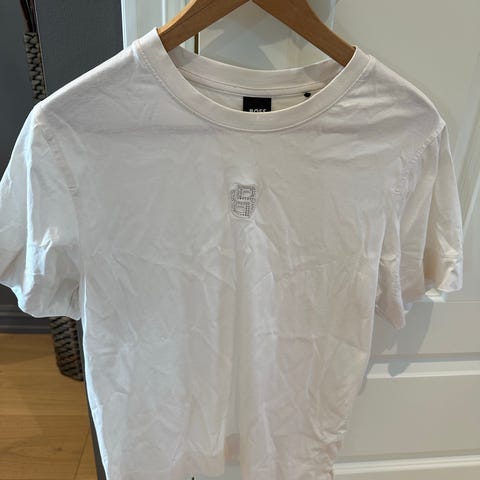 Hugo Boss T-skjorte i størrelse S for kvinner. T-skjorten er rosa og laget av bomull. Litt innsvinget, helt ny ikke brukt pga. for liten.