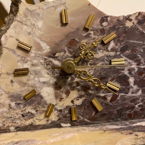 Bordklokke laget av agat med et gullfarget stativ. Klokken har en naturlig steinplate som urskive og mekanisk urverk på baksiden. Passer til dekorasjon og tidtaking i hjem eller kontor.