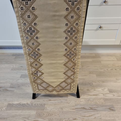 Selger søm til Hardanger-bunadskjorte. Det mangler en litt bredere del for å sy den fast på skjorten, men med litt fantasi går det sikkert an å få det til, men selve broderiet er veldig pent utført.