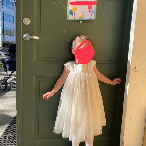 En vakker hvit prinsessekjole for en liten jente på 3–4 år.