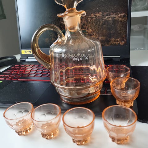 Transparent glass i tåredråpe form med graverte stjerner i mønster. Kan brukes som matolje/eddik karaffel med sin delikat formet sjenketut.