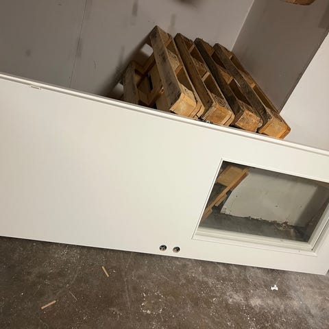 Døren har vært montert i eget hjem og selges på grunn av oppussing. Alt du trenger for montering følger med: dørblad, skinner, lister og karm.