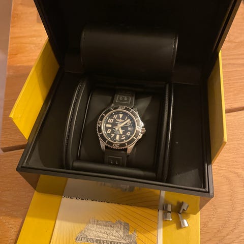 Breitling Avenger 2 Seawolf med svart urskive og gummirem. Klokken har tydelige timeindikatorer, datovisning og roterbar bezel. Remmen er laget av svart gummi med logo. Klokken er designet for herrebruk.