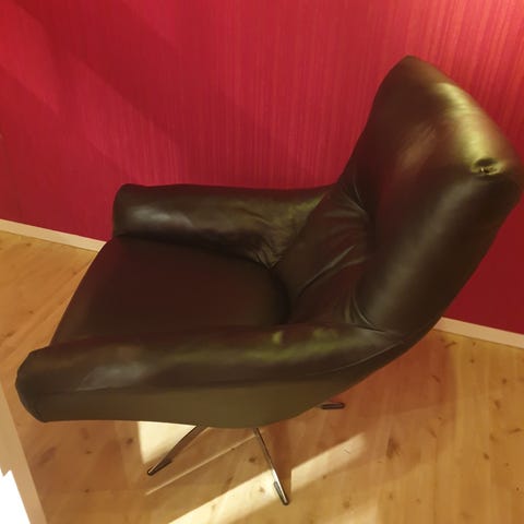Veldig kul cognac farget skinnstol. Nesten ikke sittet i, stått til pynt i en gang. Vippefunksjonen er defekt/ har aldri fungert som den skal. Må hentes på Rauland event Porsgrunn.