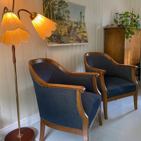 Min farmor (født 1903) giftet seg på nytt i 1955 og fikk trukket om sofa i dette blå stoffet.