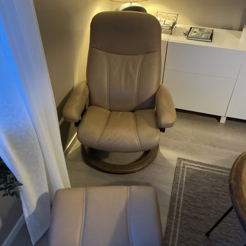 2 stk. Stressless med puffer selges. Hel og pen. Men noe lysere hud på ene armlene etter for hard vask. 7 000,- for en, 14 000,- for begge. Pris kan diskuteres.