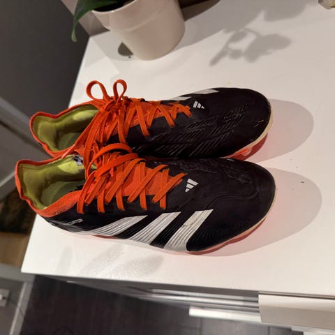 Puma King Hero FG fotballsko i størrelse 42,5. Skoene har en svart og rød fargekombinasjon, med knotter på yttersålen tilpasset for fast underlag (FG). Materialet er syntetisk.