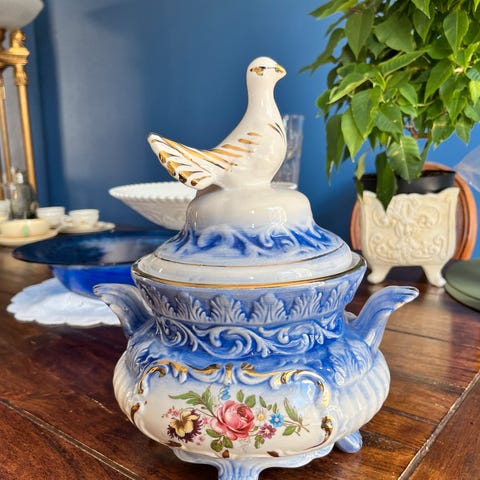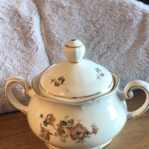 Suppeterriin eller bolle i porselen med lokk og to håndtak. Dekorert med lilla og grønne blomster. Passer til servering av supper eller matretter
