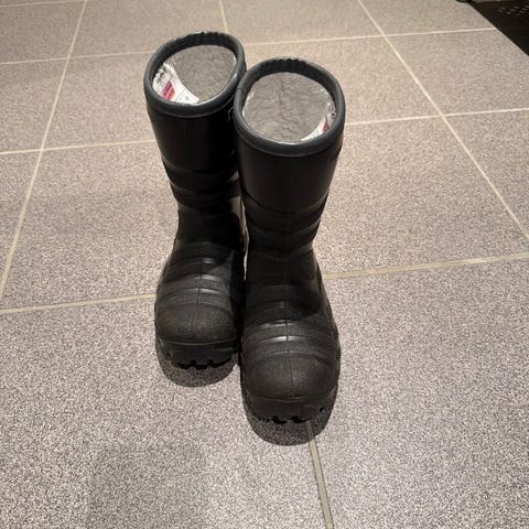 Noe stoff er gnagd bort inni skoene, bak i hælen på veggen (se bilder 6 og 7). Ellers er i god stand.