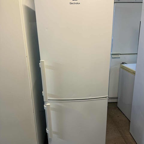 Samsung kombiskap med kjøleskap og fryser i ett. Hvitt design med digitalt kontrollpanel. Flere hyller og skuffer for oppbevaring av matvarer.