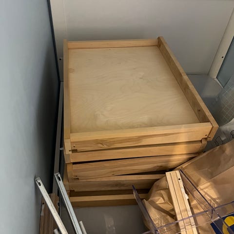 Bakplaten mangler så den inneholder kun begge sidene, toppen og bunnen. Den ene siden er malt i en lys farge (tror det er Jotun Skumring). Det er skåret av et par cm i bunnen.