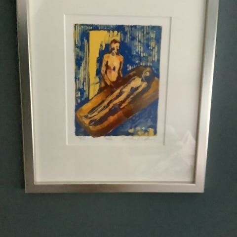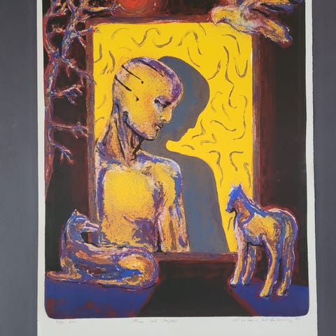 Jeg selger deler av en privat kunstsamling for en slektning som ikke er på Finn.no. Dette litografiet av Nico Widerberg måler 60x68 cm med ramme og heter "Løftet II". Det selges for 5000 kroner.