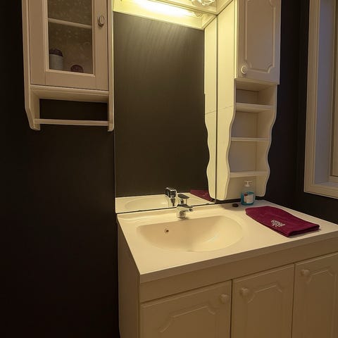 Speil med integrerte lys montert på hver side. Innebygd belysning med LED-lyskilder. Speilet har en rektangulær form 120 cm bredde og har vært montert på bad.