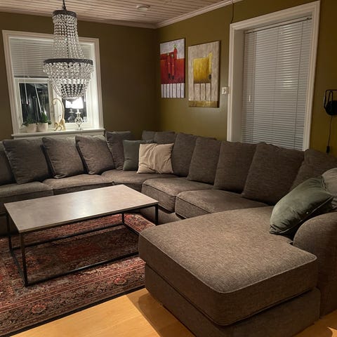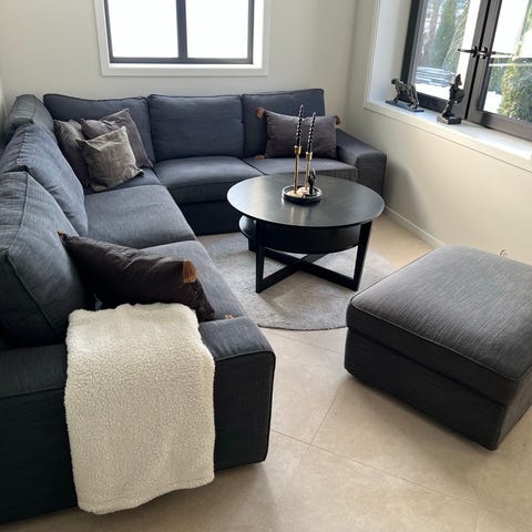 Fin brukt blå hjørnesofa far bohus og fin brukt teppe fra skeidar og svart sofabord selger alt til 5000 kr .