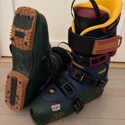K2 Method FL3X 90 alpinstøvler i størrelse 26,5. Støvlene har justerbare spenner og en kombinasjon av hvit, svart og brun farge. Designet for unisex bruk med funksjoner som gir støtte og komfort ved alpint skiing.