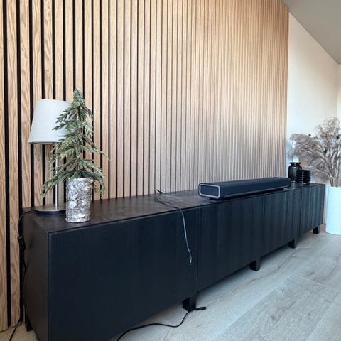 Selger en bestå TV benk i eikfarge lys, under 1 år gammel. Ingen synlige merker. En hylle i de to høyre skapene, det siste skapet er helt åpent uten hyller. Alle 3 har dører med trykk-åpne-beslag i samme farge.