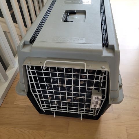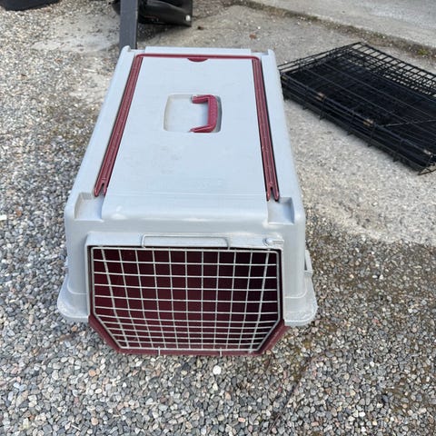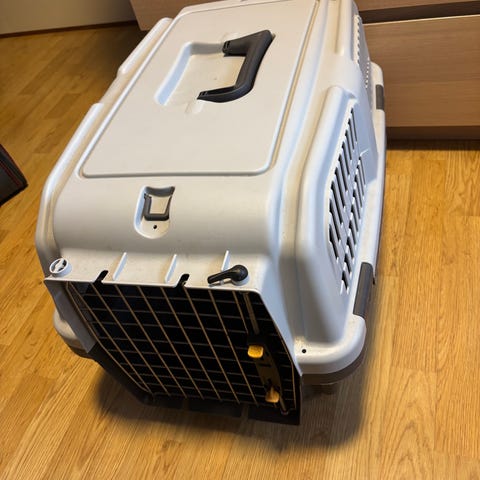 Transportbur for kjæledyr med metallgitterdør og fôrmatte.