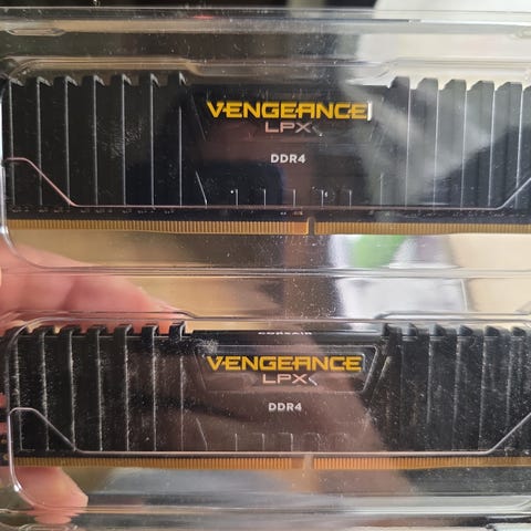 Corsair Vengeance RGB RT RAM med en hastighet på 3200 MHz og kapasitet på 16 GB (2x8 GB). RAM-modulene har RGB-belysning og er designet for stasjonære datamaskiner.