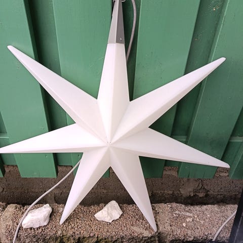 Julestjerne som kan henges i henges eller på fot. Den er: Ø 100cm stor.