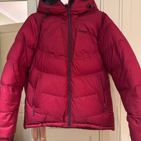 Pent brukt Bergans modell "Rjukan" dunjakke, ekstra varm, vindtett og vannavvisende, designet for kalde vinterdager, 90 % dun, 10 % fjær, 700 cuin, avtagbar hette med justering,frontlommer og innelomme med glidelås, elastiske mansjetter med tommelhull(pulsvarmer)justerbar på sidene, selges da den ikke brukes lenger.