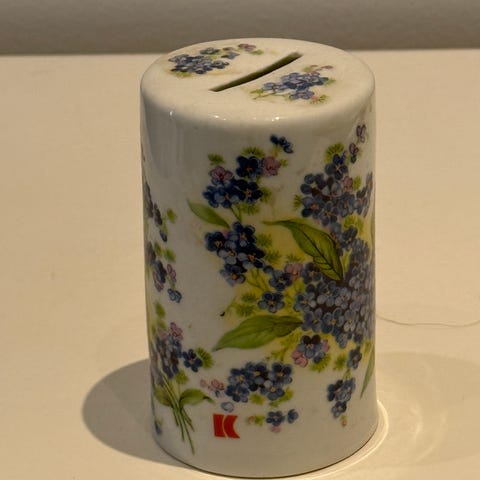 Gammel Akers Sparebank sparebøsse laget av glass med metalllokk. Sparebøssen har et lokk som kan åpnes med nøkkel, og er merket med Akers Sparebank-logo og serienummer. Fra 50-tallet. Det er kanskje greit å ha noen kontanter her i disse urolige tider? Da er det ok at nøkkel mangler!