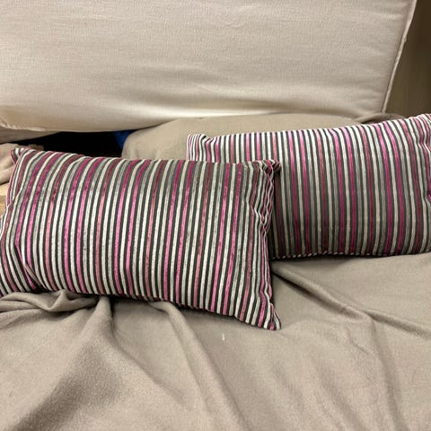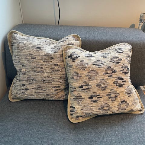 2 putetrekk, mørk grå med ferskenfarget mønster. Princes