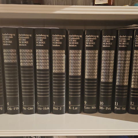 Den Store Krigen bokserie med rød skinninnbinding og dekorative detaljer. Serien består av flere bind, utgitt av Gyldendal Norsk Forlag. Bøkene dekker omfattende historisk innhold om krigen, med bidrag fra flere forfattere og redaktører.