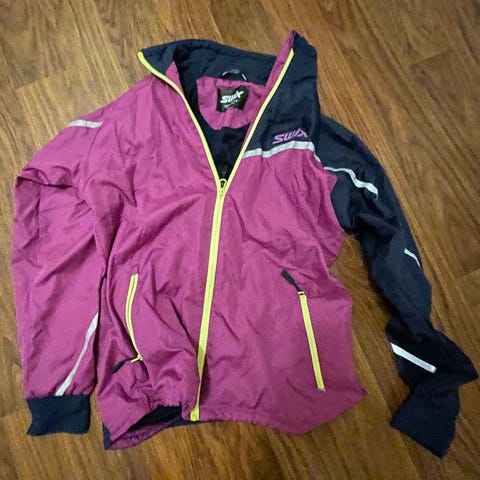 Swix dame langrennsdress i fargene rød, blå og hvit. Dressen består av overdel med glidelås og tilhørende bukse, designet for langrenn. Materialet er tilpasset for fysisk aktivitet og vinterbruk.