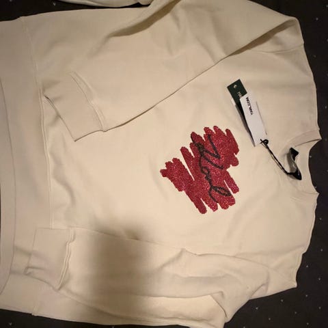 KARL LAGERFELD for H&M genser i størrelse M, laget av bambusviskose. Genseren er svart med røde og hvite striper rundt midjen og på ermene. Den har v-hals og to lommer foran.