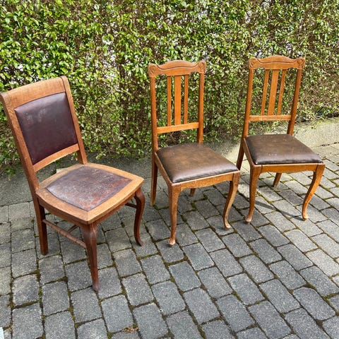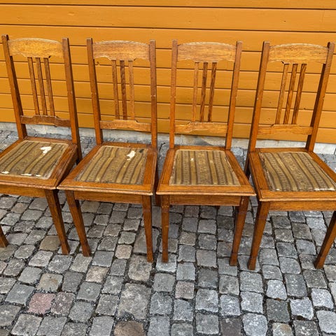 2 gamle spisestuestoler selges samlet. De trenger en oppstamming.
