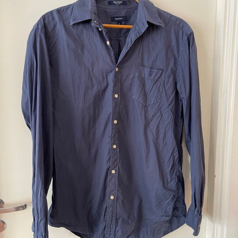 GANT skjorte i blå farge med hvite striper, størrelse XXL. Laget av bomull, designet for herre. Skjorten har knappestolpe foran og mansjetter med knapper. Veldig lite brukt. Passer også de som bruker L og XL.