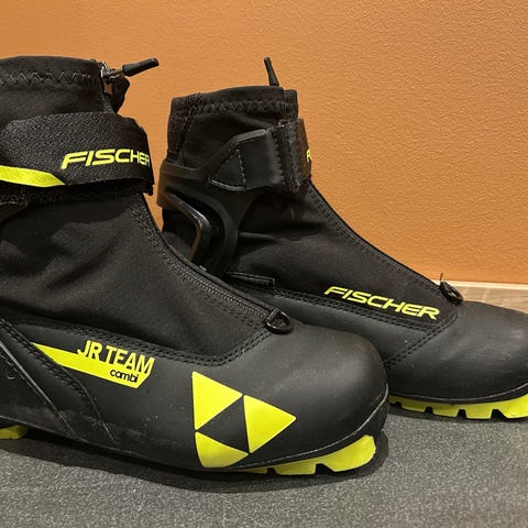 Fischer JR Combi skisko i størrelse 38. Skiskoene har svart og gul farge og er designet for juniorbruk. De har glidelås foran og borrelås for justering og støtte.